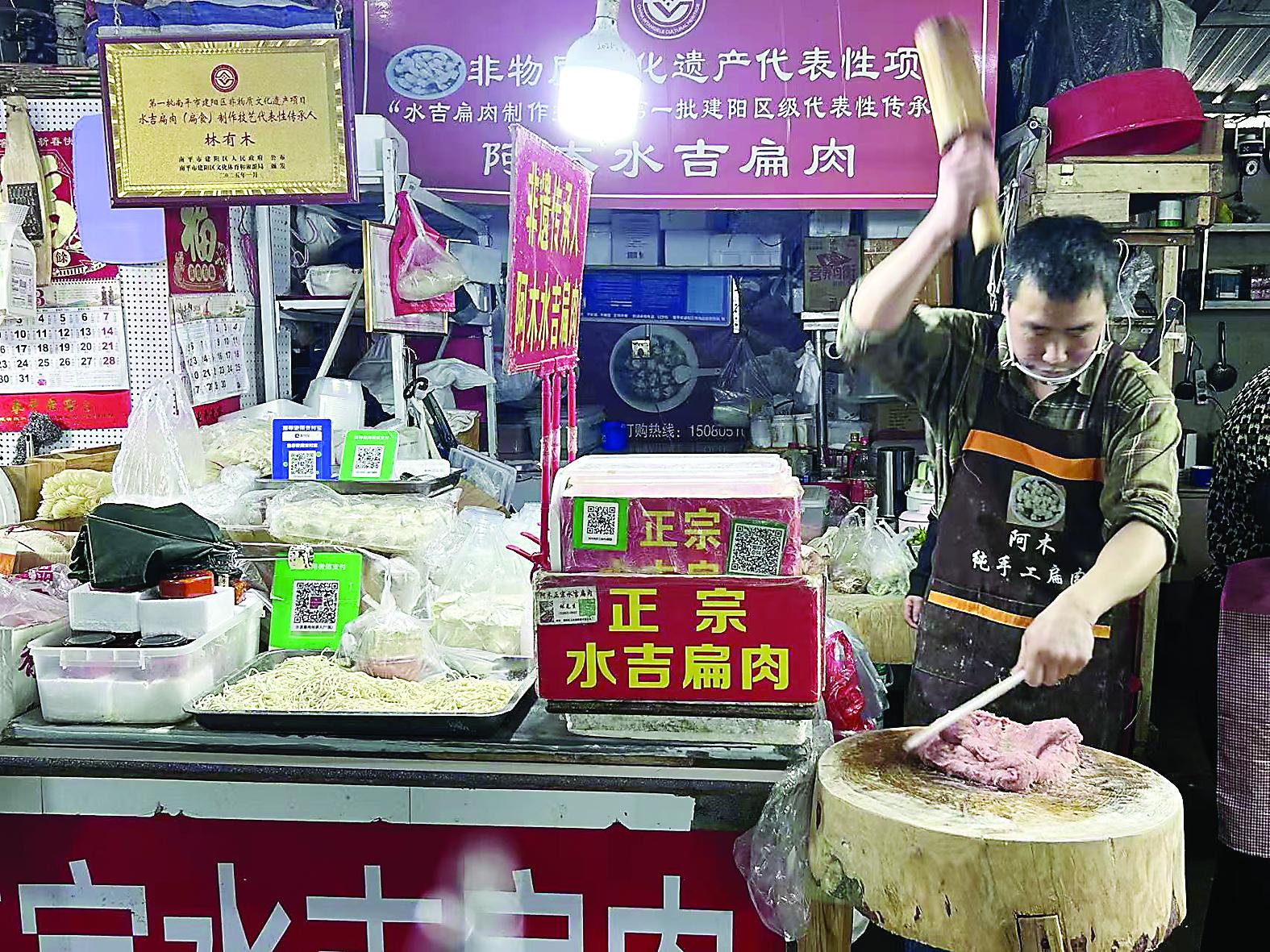 “一人富不算富,大家一起把扁肉产业做起来,水吉的名气才更响。”清晨五点,水吉镇的集市刚苏醒,建阳区非遗传承人、水吉镇乡厨冯启亮就已穿梭在肉摊间。