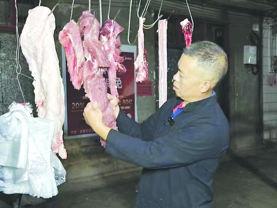 冯启亮在挑选新鲜土猪后腿肉