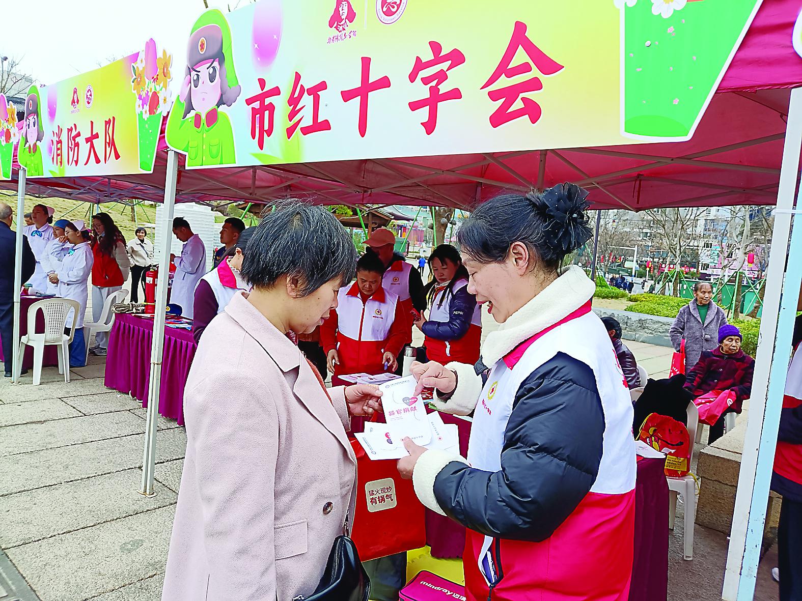 活动现场,鲜红的主题横幅格外醒目,咨询展台前围满了前来问询的市民;红十字志愿者们身着志愿服装,向过往群众发放《器官捐献知识》宣传册,细致讲解人体器官捐献的意义、志愿登记流程、国家相关法律法规等内容。
