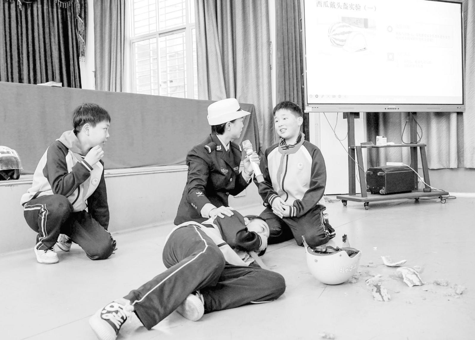 3月30日是第31个“全国中小学生安全教育日”,当日,武夷山市公安局交通管理大队组织民警到辖区小学开展以“同守护 共成长”为主题的安全教育活动,引导学生自觉遵守交通法规。图为在模拟事故现场,民警讲解处置方法。