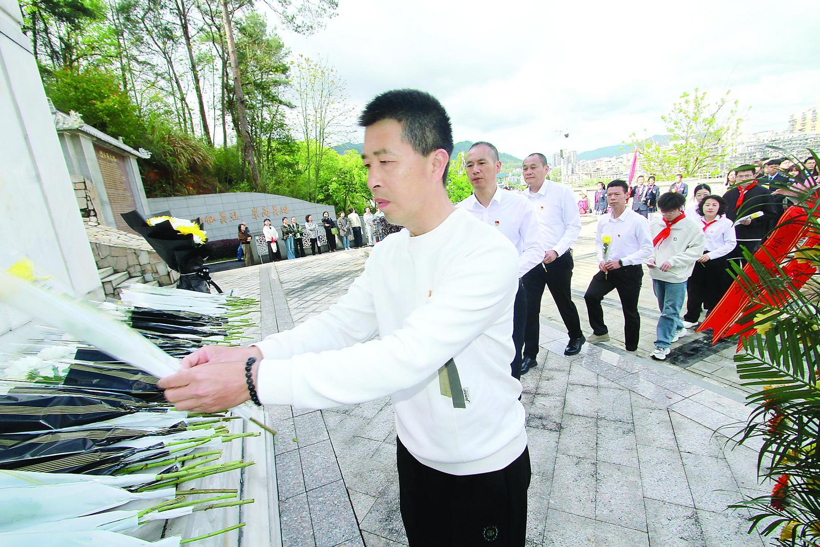 1日,武夷山市社会各界在赤石烈士陵园开展“缅怀革命先烈·弘扬革命精神” 清明祭扫活动。大家敬献花篮花圈,肃立默哀,聆听赤石暴动革命故事,缅怀革命先烈。 (邱汝泉 摄)