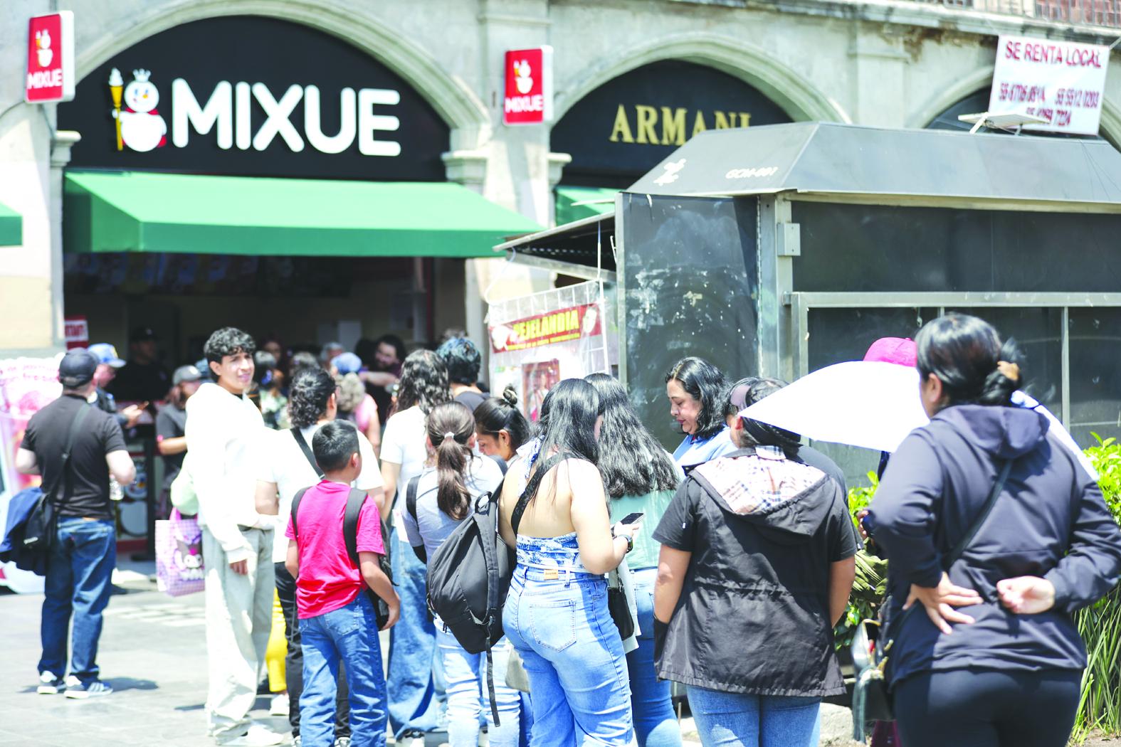 4月1日,在墨西哥首都墨西哥城的宪法广场,消费者排队等待购买蜜雪冰城的产品。
