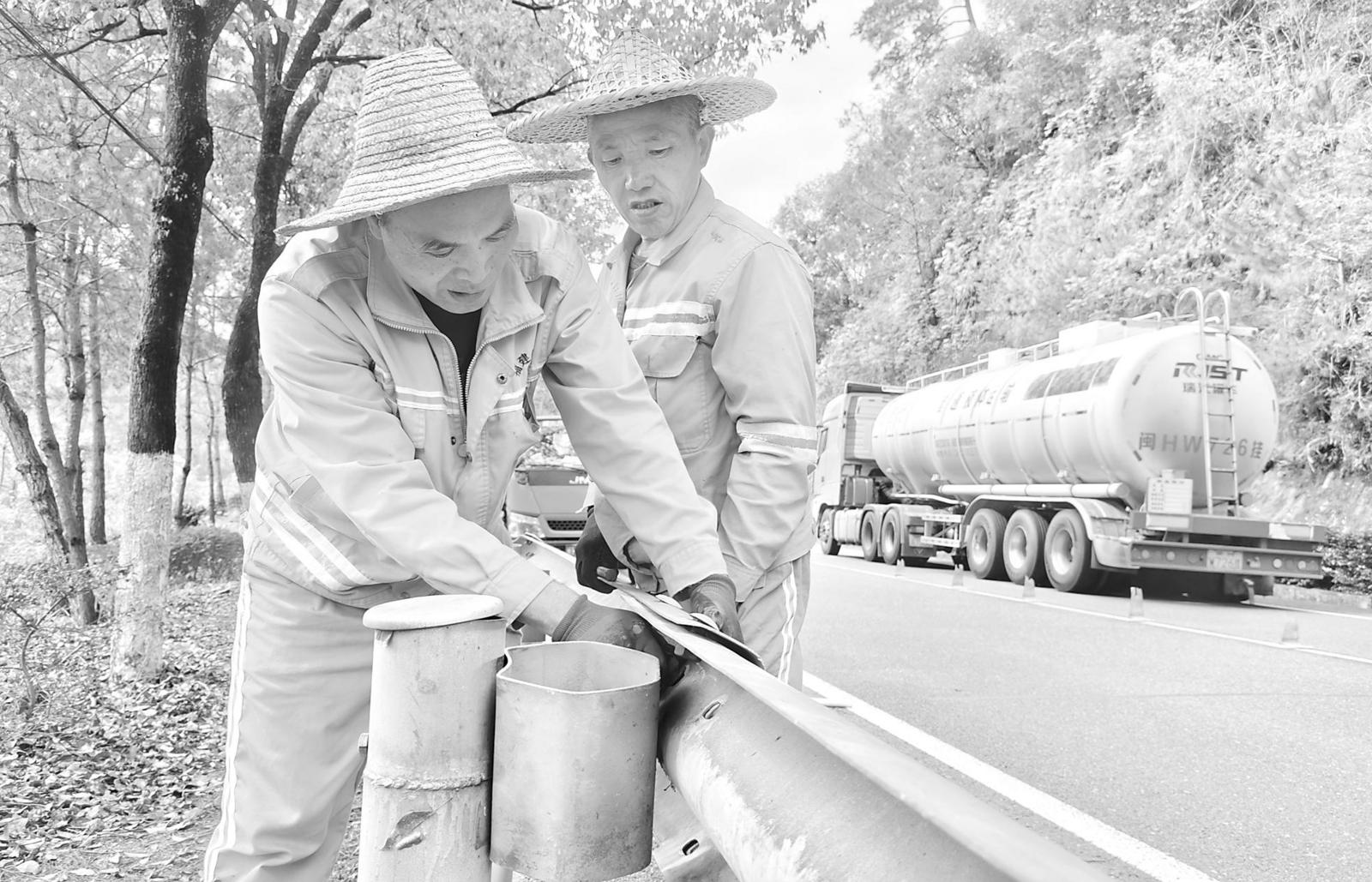 日前,公路养护人员在修复国道上的护栏。近期,建瓯公路部门全面开展汛期安全隐患排查治理工作,对辖区内国省干线公路沿线高陡边坡、安防设施、排水系统、桥涵隧构造物等关键部位开展检查,保障群众出行安全顺畅。(钟云飞 钟建业 摄)