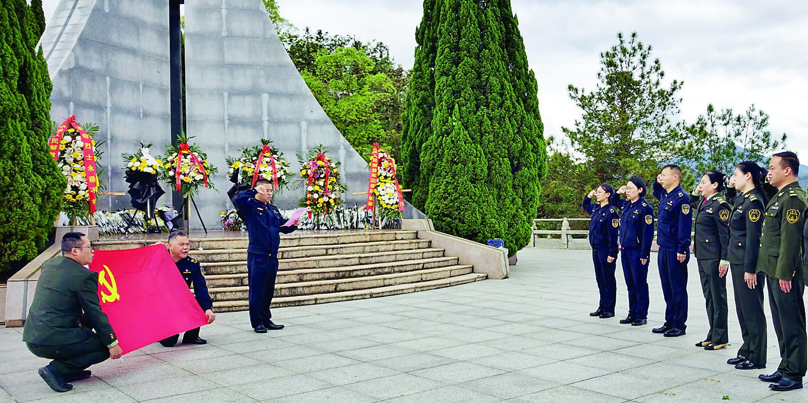 4月1日,南平高速执法支队一大队党支部联合南平高速公司延平管理中心、延平养护站等单位,组织党员干部赴延平区九峰山革命纪念碑,开展“缅怀革命先烈 传承红色基因”主题党日活动,通过沉浸式教育引导党员干部从革命历史中汲取精神力量,以实际行动践行初心使命。图为党员干部在纪念碑前重温入党誓词。 (苏晋垚 摄)