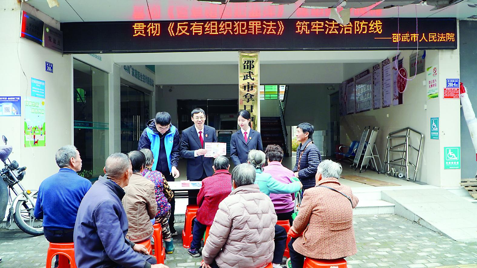 近日,邵武法院组织干警走进拿口镇开展常态化普法宣传活动。活动中,干警结合审判实践,用通俗易懂的语言解读《中华人民共和国刑法》《中华人民共和国反有组织犯罪法》及扫黑除恶相关法律法规,深入剖析“村霸”“市霸”“行霸”犯罪的危害特征与法律后果,引导村民增强自我保护意识与依法维权能力。图为干警与村民互动交流。 (张慧 摄)
