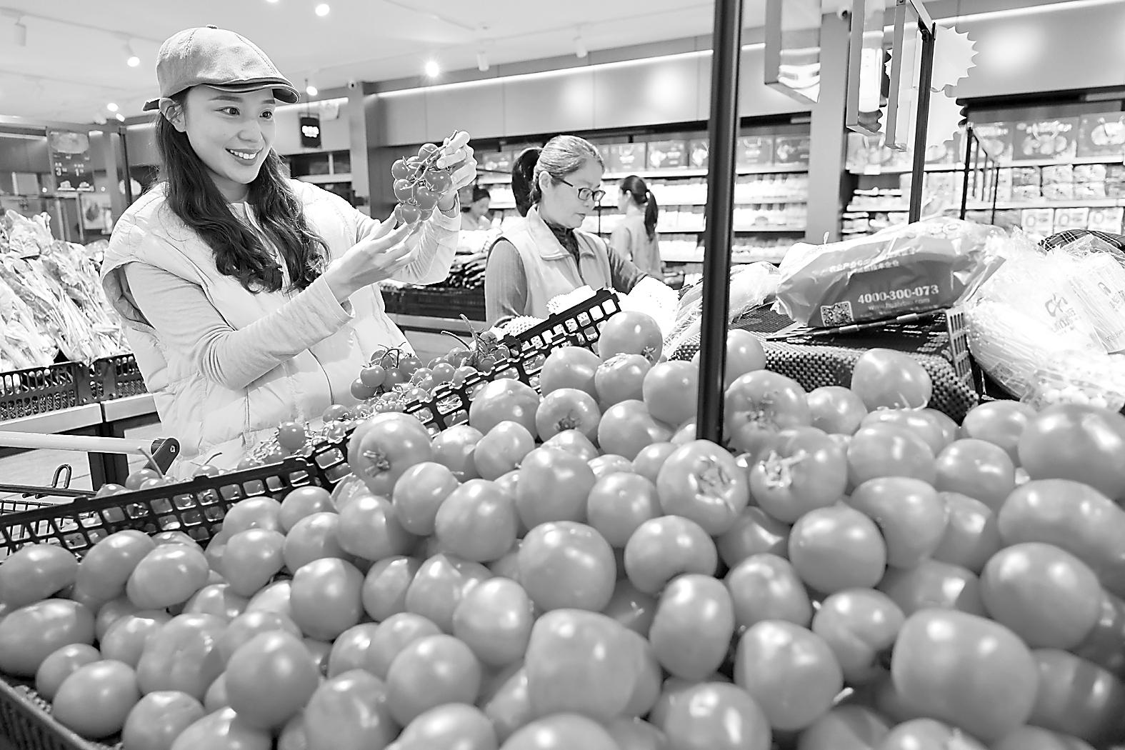 4月10日,消费者在山东省枣庄市一家超市选购小西红柿。