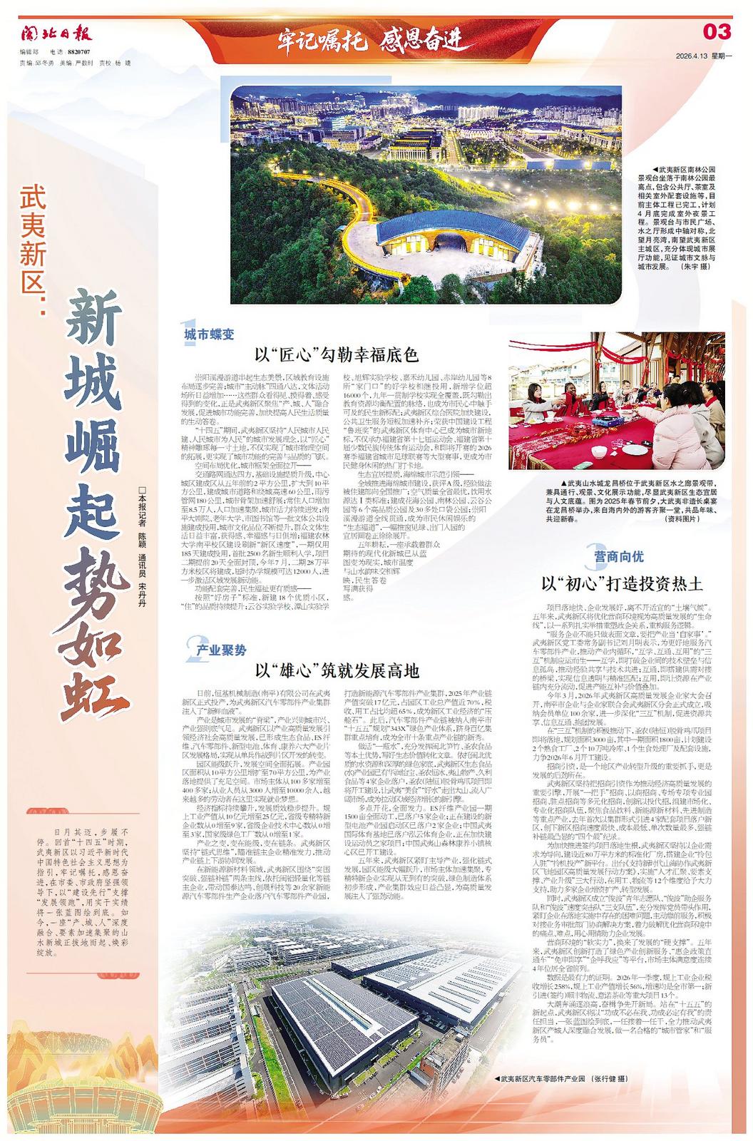 大潮奔涌逐浪高,奋楫争先开新局。站在“十五五”的新起点,武夷新区将以“功成不必在我、功成必定有我”的责任担当,一张蓝图绘到底,一任接着一任干,全力推动武夷新区产城人深度融合发展,做一名合格的“城市管家”和“服务员”。
