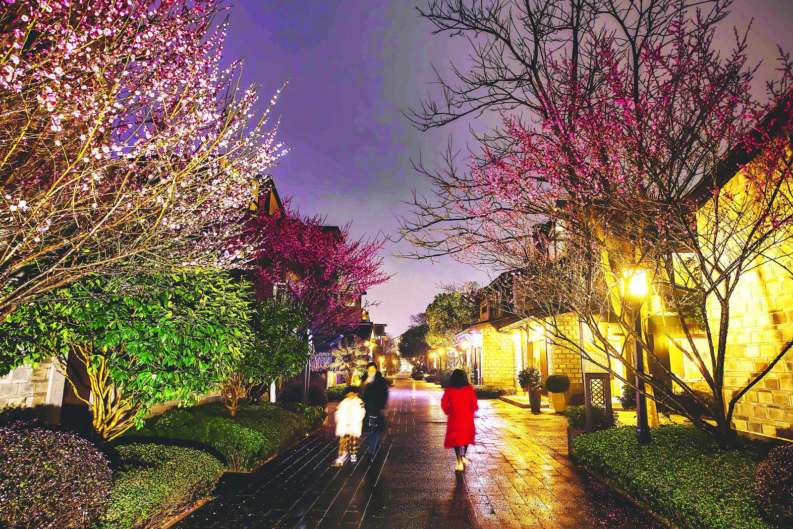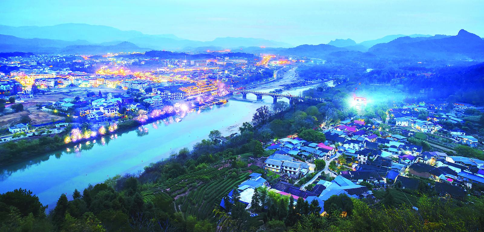 刹那间,一束束暖光次第亮起,从大王峰路的沿街建筑,到崇阳溪畔的漫步道,从历史古城的青石板路,到民宿村的曲径通幽,温润的“茶汤色”铺满山河街巷。