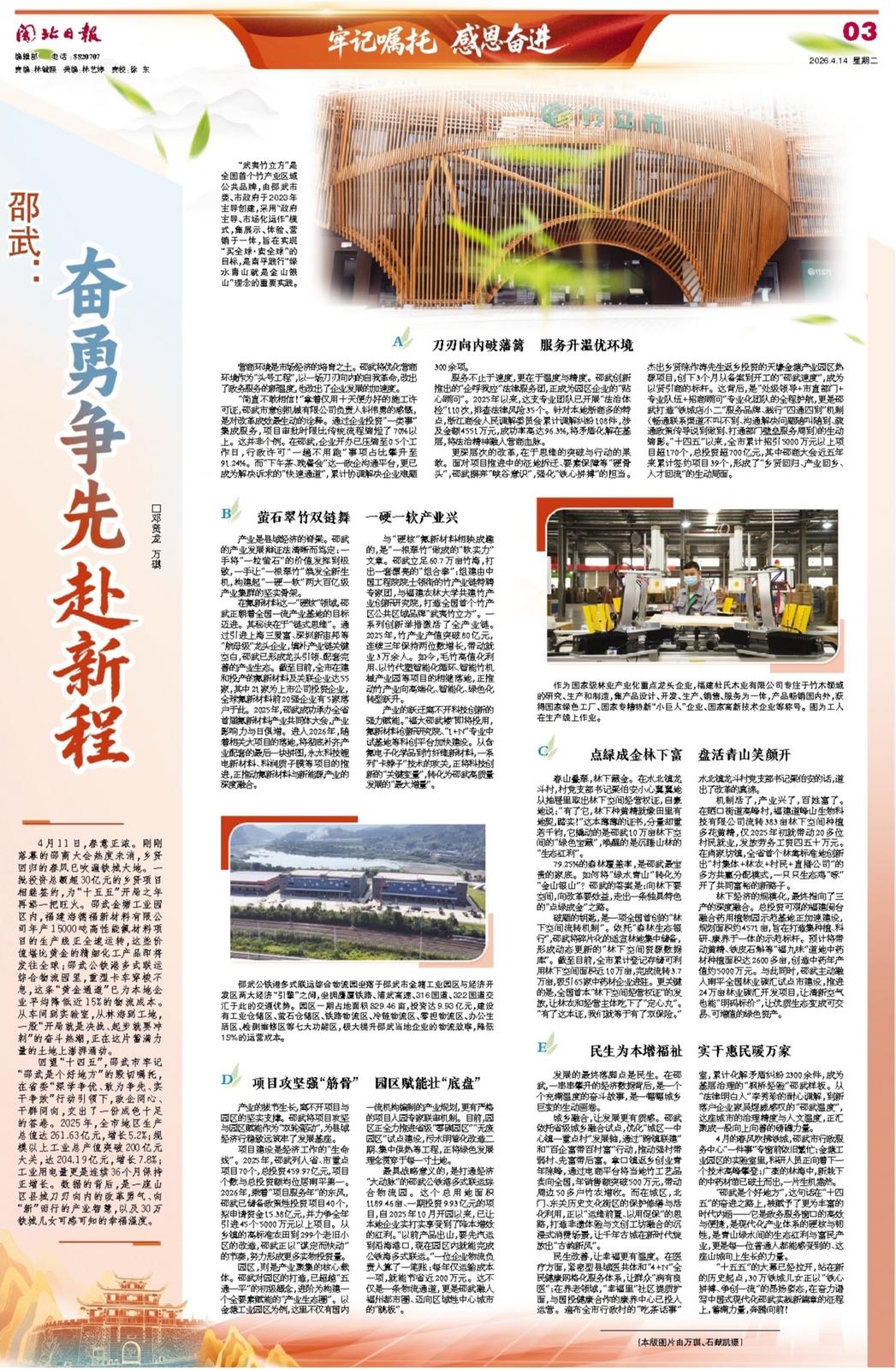 与“硬核”氟新材料相映成趣的,是“一根翠竹”做成的“软实力”文章。邵武立足60.7万亩竹海,打出一套漂亮的“组合拳”:组建由中国工程院院士领衔的竹产业链特聘专家团,与福建农林大学共建竹产业创新研究院,打造全国首个竹产区公共区域品牌“武夷竹立方”。一系列创新举措激活了全产业链。2025年,竹产业产值突破80亿元,连续三年保持两位数增长,带动就业3万余人。如今,毛竹高值化利用、以竹代塑智能化循环、智能竹机械产业园等项目的相继落地,正推动竹产业向高端化、智能化、绿色化转型跃升。