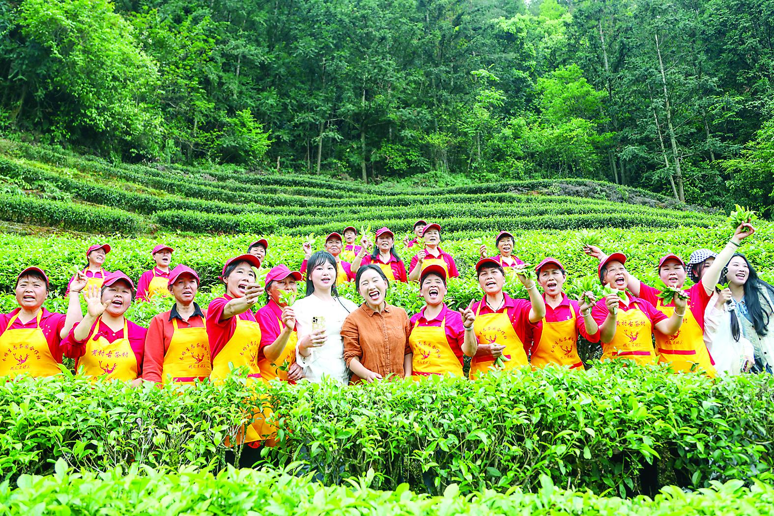 4月15日,武夷山市星村镇黄村木坜生态茶园举行“春山寻春色·沈丹带你来采茶”开山采茶仪式。传统的开山仪式融合祈福文化与祭祀礼仪,生动展现茶文化的历史传承。图为村民、游客与沈丹一同体验春茶采摘。