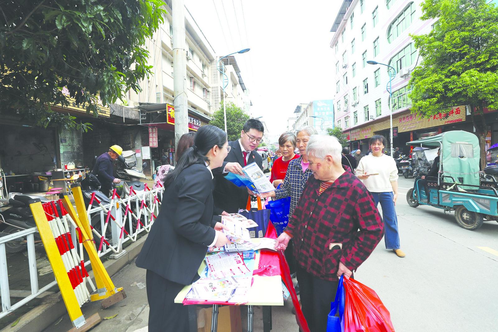 4月14日,正值政和县东平镇圩日,政和法院干警到集市开展全民国家安全教育日法治宣传活动。干警们通过悬挂横幅、发放普法宣传手册,向赶集的群众耐心讲解国家安全法、反有组织犯罪法等法律法规,让大家在赶集间隙学习国家安全相关法律知识。图为干警向群众进行普法宣传。 (李莉 范美芳 摄)