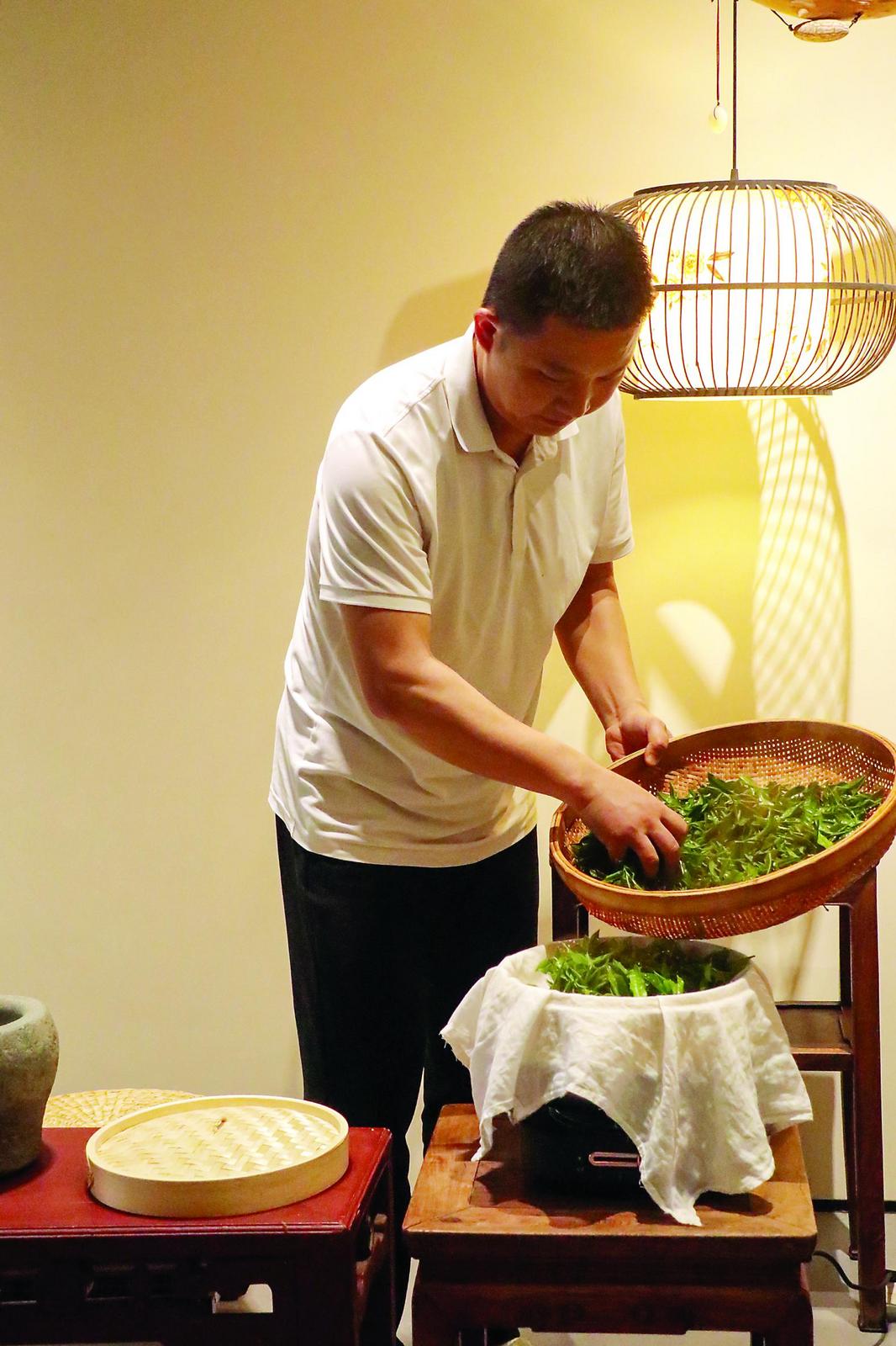“我们做的不仅是茶,还是会呼吸的文物。”高伟将蒸好的茶青榨去茶汁,置于青石茶碾内,注入山泉开始研茶。