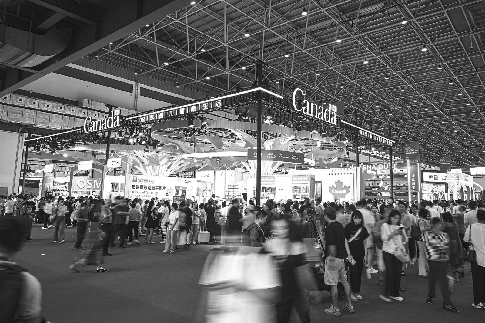 第六届消博会加拿大国家馆所在的全球特色消费展区人头攒动。加拿大是本届消博会主宾国。 (新华社记者 蒲晓旭 摄)