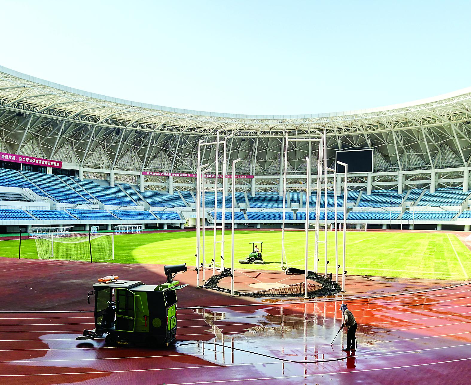 南平市体育中心为2026年福建省城市足球联赛(“闽超”)南平队的主场,连日来,场馆升级各项工作正有序推进,为5月3日首个主场对阵莆田队做准备。图为工作人员在养护草坪和清洁场馆。 (张行健 摄)