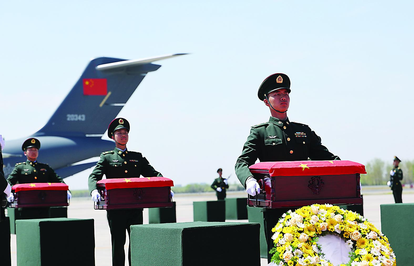 4月22日上午,第十三批在韩中国人民志愿军烈士遗骸由中国空军运-20B从韩国接回辽宁沈阳。12位志愿军烈士英灵及146件遗物回到祖国怀抱。