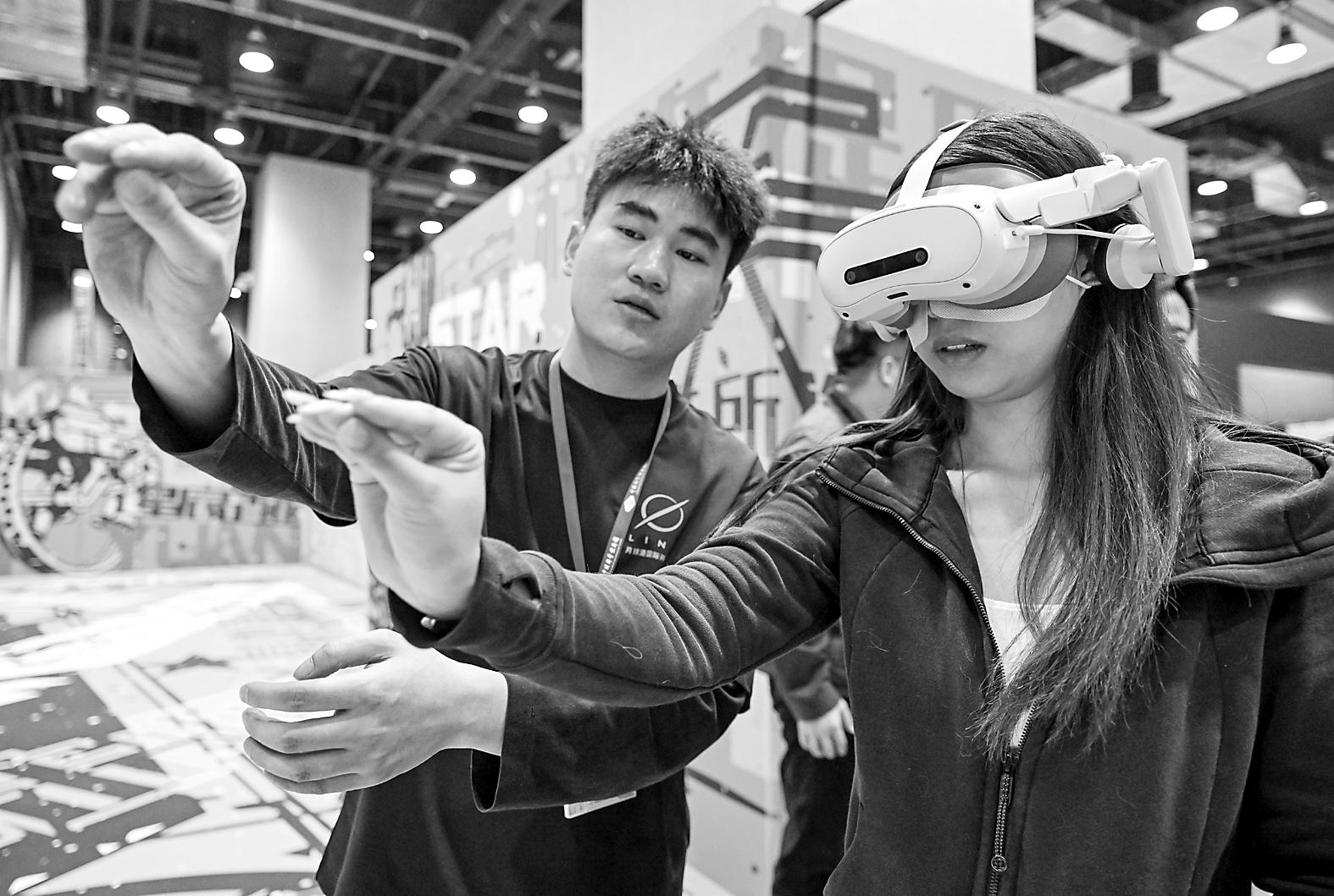 4月23日,工作人员协助体验者在主题展上体验VR科普科幻剧。这是本次展览的最大亮点,基于真实探月数据打造。体验者将以第一视角“穿越”至2049年月球南极“天枢”基地,亲历火箭发射、地月轨道转移、太空漫步、载人登月、月面科考等全流程场景,直面陨石撞击、宇宙射线、太阳风暴等震撼特效。