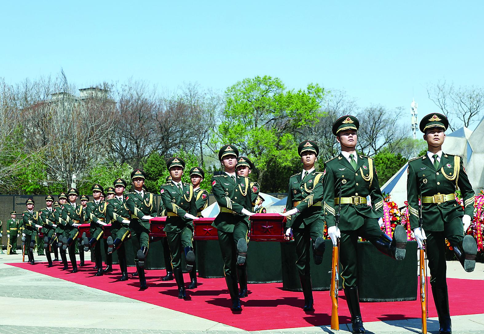 4月23日,在沈阳抗美援朝烈士陵园,礼兵护送烈士遗骸棺椁前往安葬地宫。