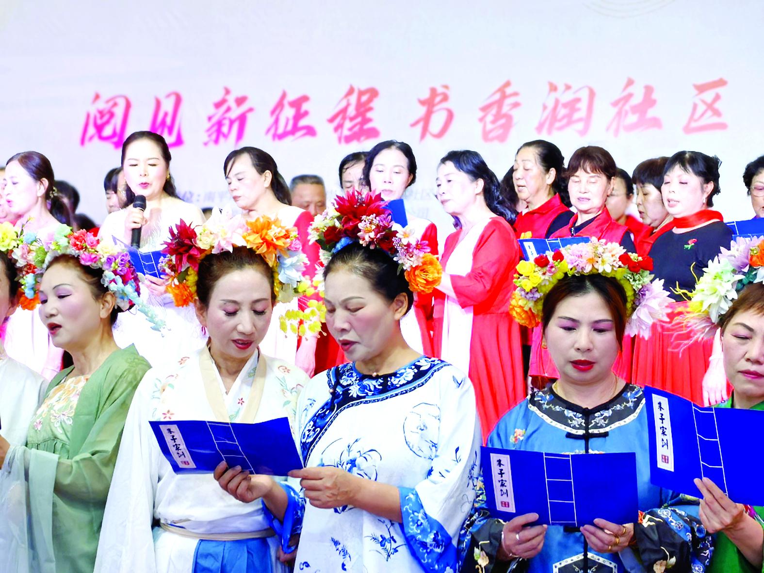 近日,建阳区崇泰街道联合南平市图书馆举行“阅见新征程 书香润社区”全民阅读活动。该活动是“书香建阳 全民阅读”文化周活动的一环,旨在营造全民阅读、共建文明社区的氛围。图为参演者集体朗诵《朱子家训》。 (程若兰 摄)
