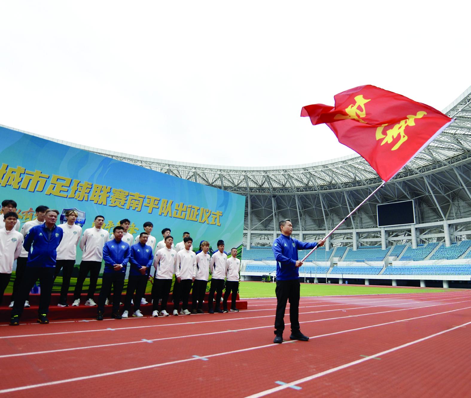 出征仪式上,南平队领队挥舞旗帜。