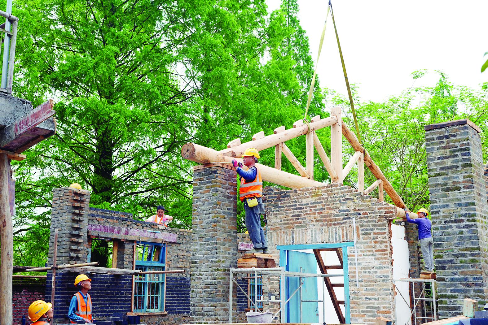 近日,走进武夷山程家洲的乡愁理想村项目施工现场,老房子间搭起了脚手架,工人们正给屋顶换上新的木质结构,刨木花从高处纷纷扬扬飘落下来,一片忙碌的景象。