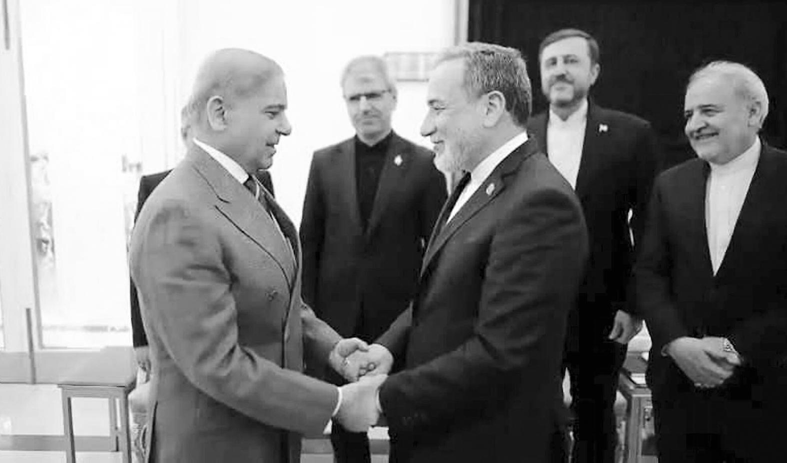 4月25日,巴基斯坦总理夏巴兹(左)在巴基斯坦首都伊斯兰堡同伊朗外长阿拉格齐举行会谈。
