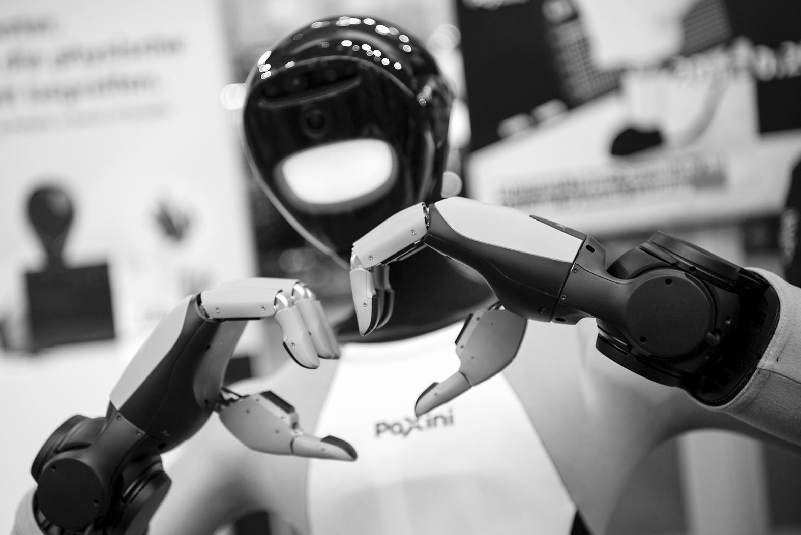 4月21日,在德国汉诺威工业博览会,一款帕西尼人形机器人向观众比心。