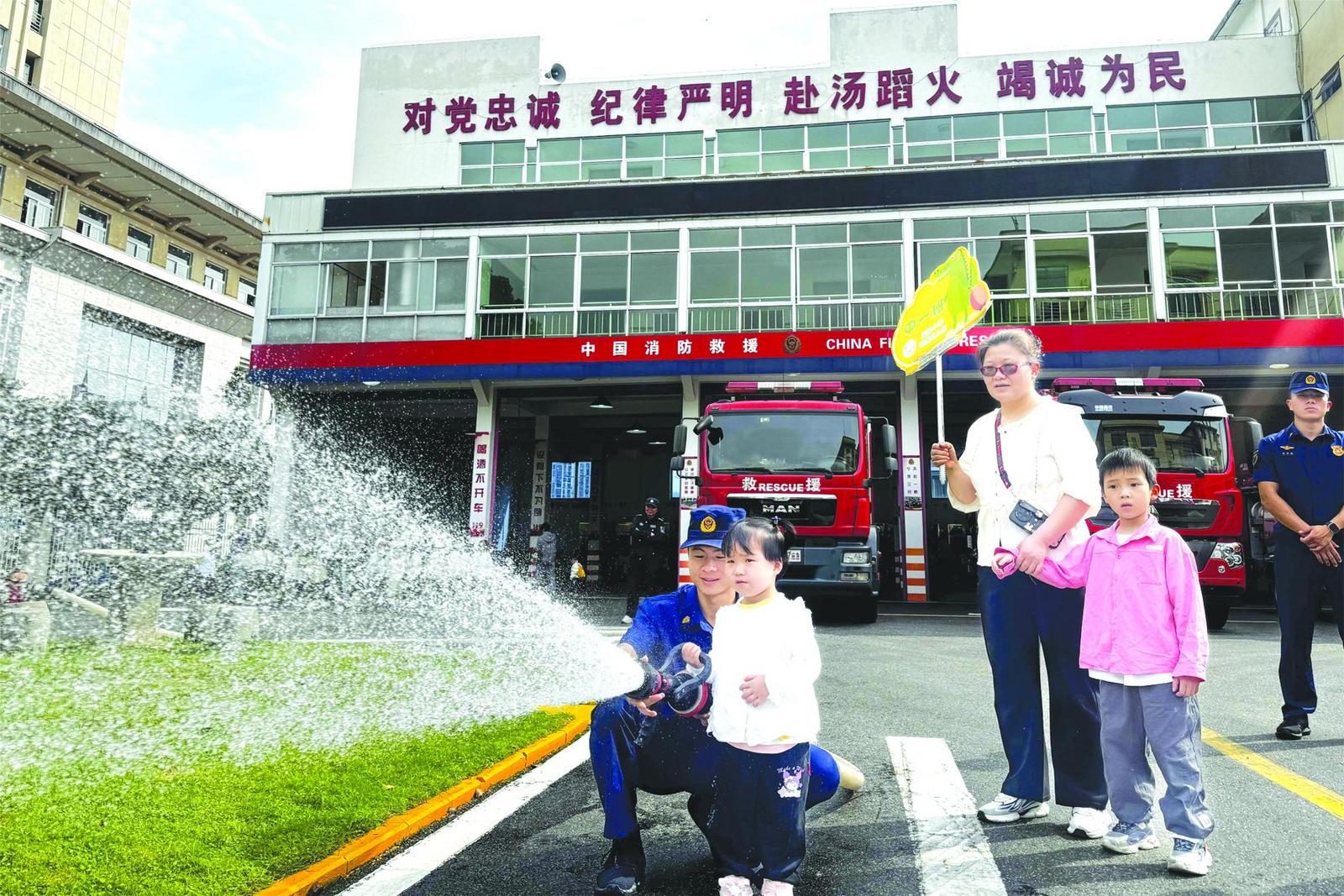 近期,浦城县消防救援局开展消防站开放活动,针对低龄儿童特点,推出“趣味科普”专场,让“消防安全”的种子在他们心中生根发芽。图为4月20日,消防员带领浦城县实验小学附属幼儿园幼儿体验水枪。