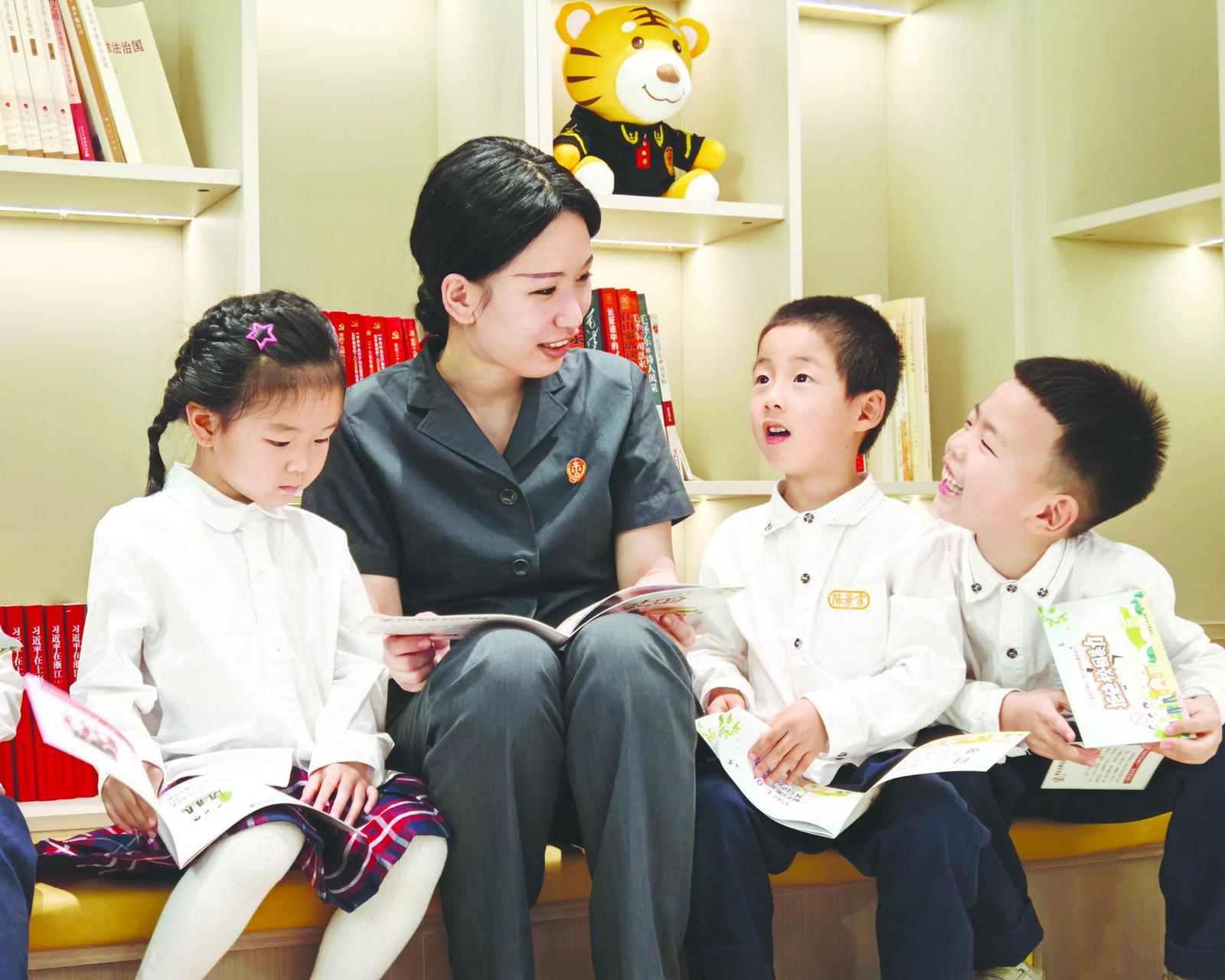 4月21日,在第31个世界读书日即将到来之际,光泽法院邀请光泽县实验幼儿园30余名萌娃走进法院,通过共读普法宣传绘本,在孩子们心中播下遵纪守法的种子。图为法院干警与小朋友一起阅读。 (张莉 摄)