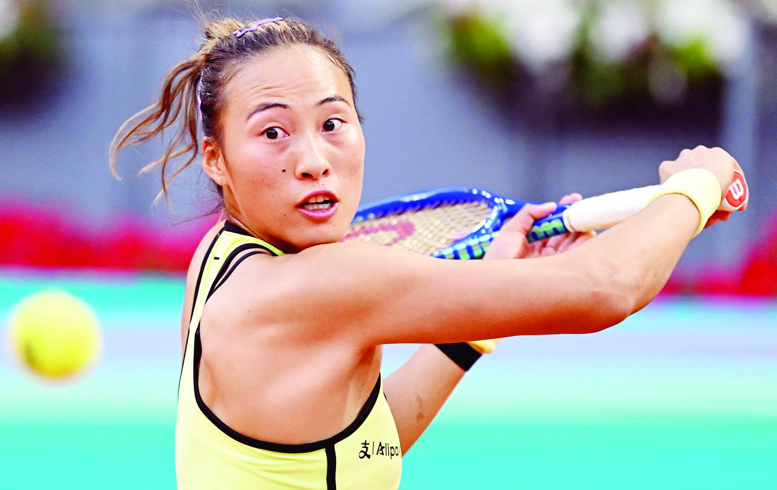 4月26日,郑钦文在比赛中回球。